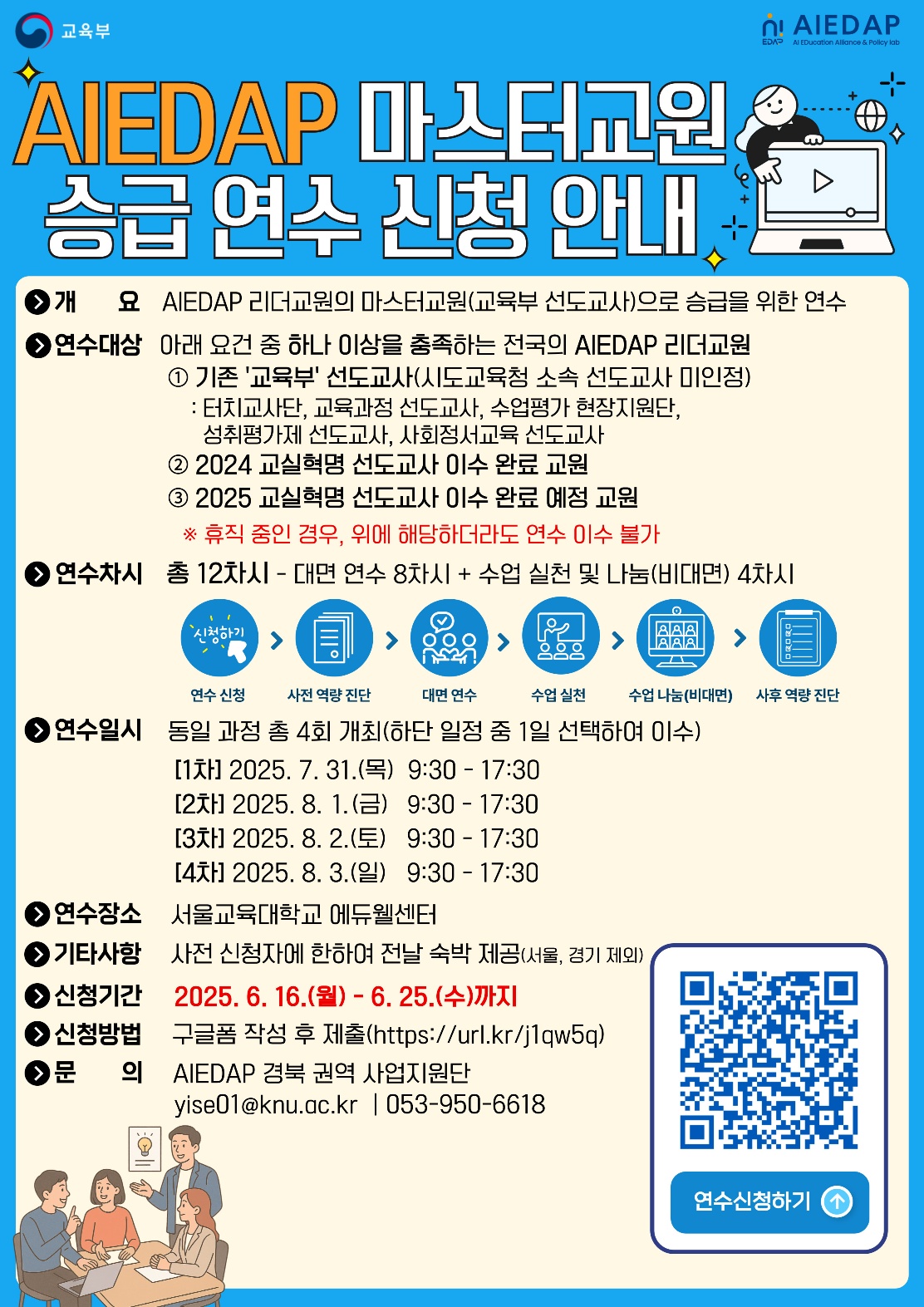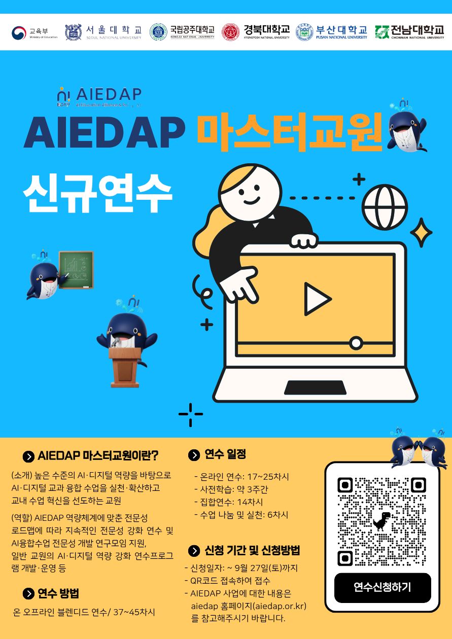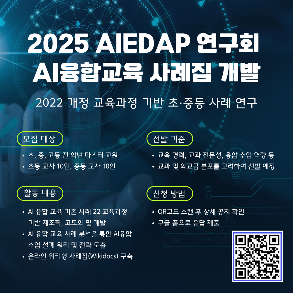 최근 교육 현장은 인공지능 및 디지털 기반의 다양한 프로그램의 등장과 함께, 이를 활용한 새로운 교육 방식으로의 변화가 일어나고 있습니다. 이에 우리는 교원들의 AI 디지털 역량을 강화하고, 저출산 시대 우리 학생들 하나하나를 위한 맞춤형 교육을 준비하고자 2022년부터 AIEDAP 사업을 추진해 왔습니다. AI 디지털 역량 함양을 위한 지원체제 구축을 시작으로, 올해는 AI 디지털 교과 융합적 전문가인 마스터 교원 1900여 명을 양성했습니다. 양성된 마스터 교원은 시도 교육청과 협력하여 교원 연수의 강사로 4천 여 회 이상 참여하는 등, 교원의 AI 융합 수업 역량 향상을 지원했습니다. 또한, 예비 교원의 AI 디지털 역량 강화를 위한 교육 과정을 개발하고, 예비 교원 대상 AI 디지털 역량 연수와 교원 양성기관 교수자 대상 AI 디지털 교과 융합 워크숍을 운영하여, 교원 양성 단계부터 역량을 함양할 수 있도록 다양한 노력을 해왔습니다. 지금 이 자리에 함께하시는 마스터 교원을 비롯해 사업 지원단, 총괄 위원회 등 우리 모두가 노력한 성과입니다.