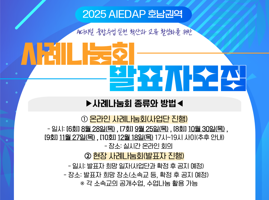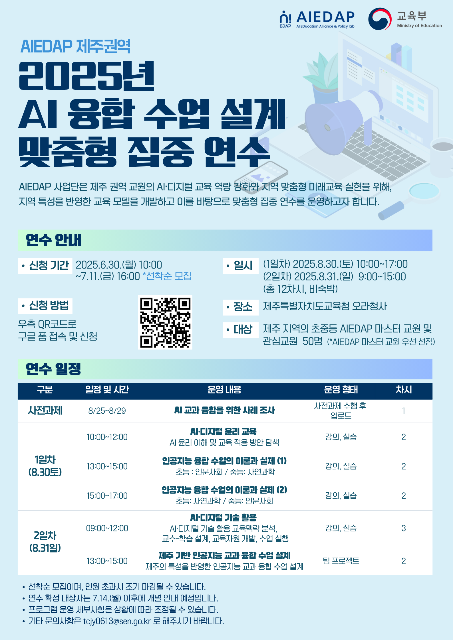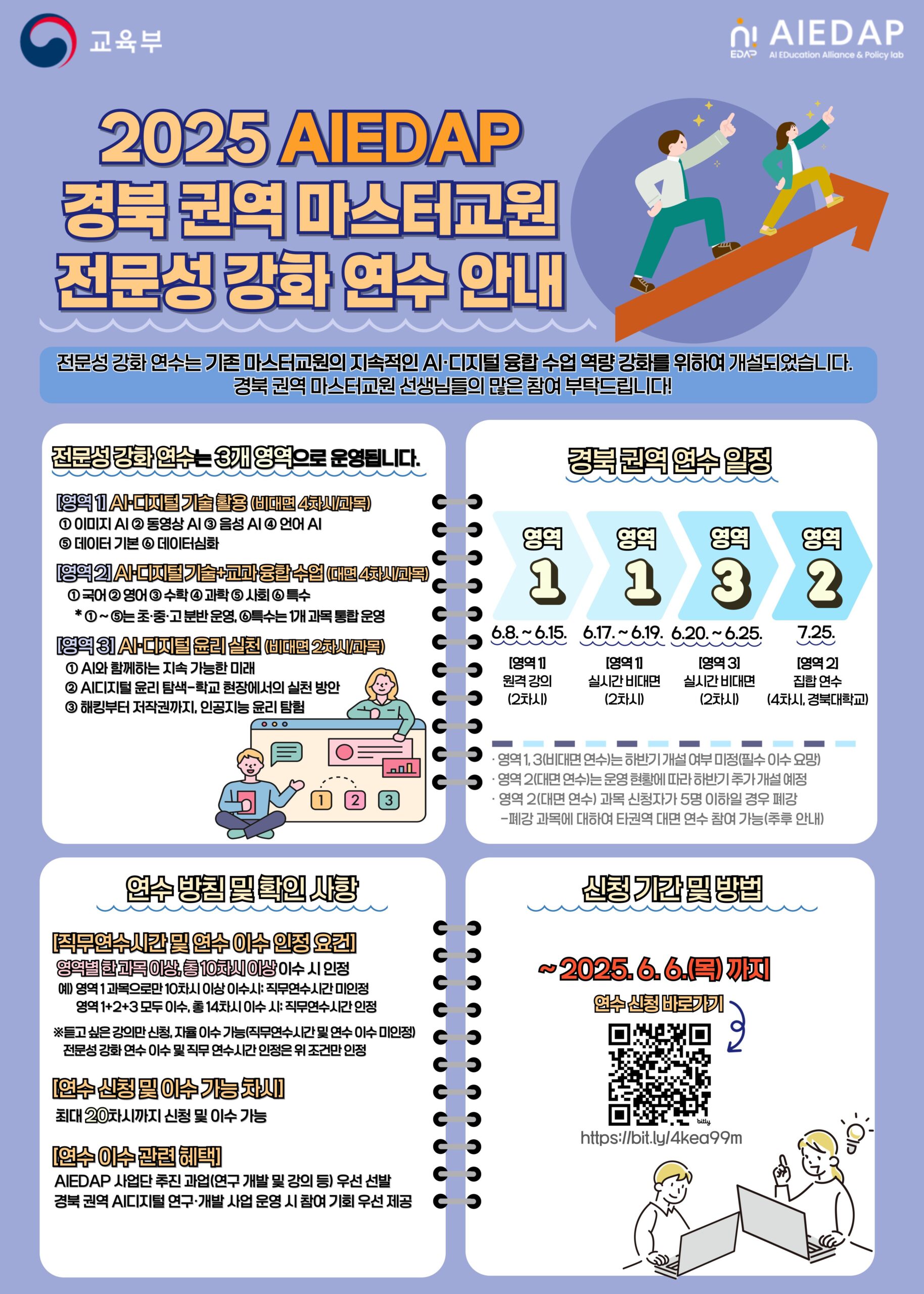 최근 교육 현장은 인공지능 및 디지털 기반의 다양한 프로그램의 등장과 함께, 이를 활용한 새로운 교육 방식으로의 변화가 일어나고 있습니다. 이에 우리는 교원들의 AI 디지털 역량을 강화하고, 저출산 시대 우리 학생들 하나하나를 위한 맞춤형 교육을 준비하고자 2022년부터 AIEDAP 사업을 추진해 왔습니다. AI 디지털 역량 함양을 위한 지원체제 구축을 시작으로, 올해는 AI 디지털 교과 융합적 전문가인 마스터 교원 1900여 명을 양성했습니다. 양성된 마스터 교원은 시도 교육청과 협력하여 교원 연수의 강사로 4천 여 회 이상 참여하는 등, 교원의 AI 융합 수업 역량 향상을 지원했습니다. 또한, 예비 교원의 AI 디지털 역량 강화를 위한 교육 과정을 개발하고, 예비 교원 대상 AI 디지털 역량 연수와 교원 양성기관 교수자 대상 AI 디지털 교과 융합 워크숍을 운영하여, 교원 양성 단계부터 역량을 함양할 수 있도록 다양한 노력을 해왔습니다. 지금 이 자리에 함께하시는 마스터 교원을 비롯해 사업 지원단, 총괄 위원회 등 우리 모두가 노력한 성과입니다.
