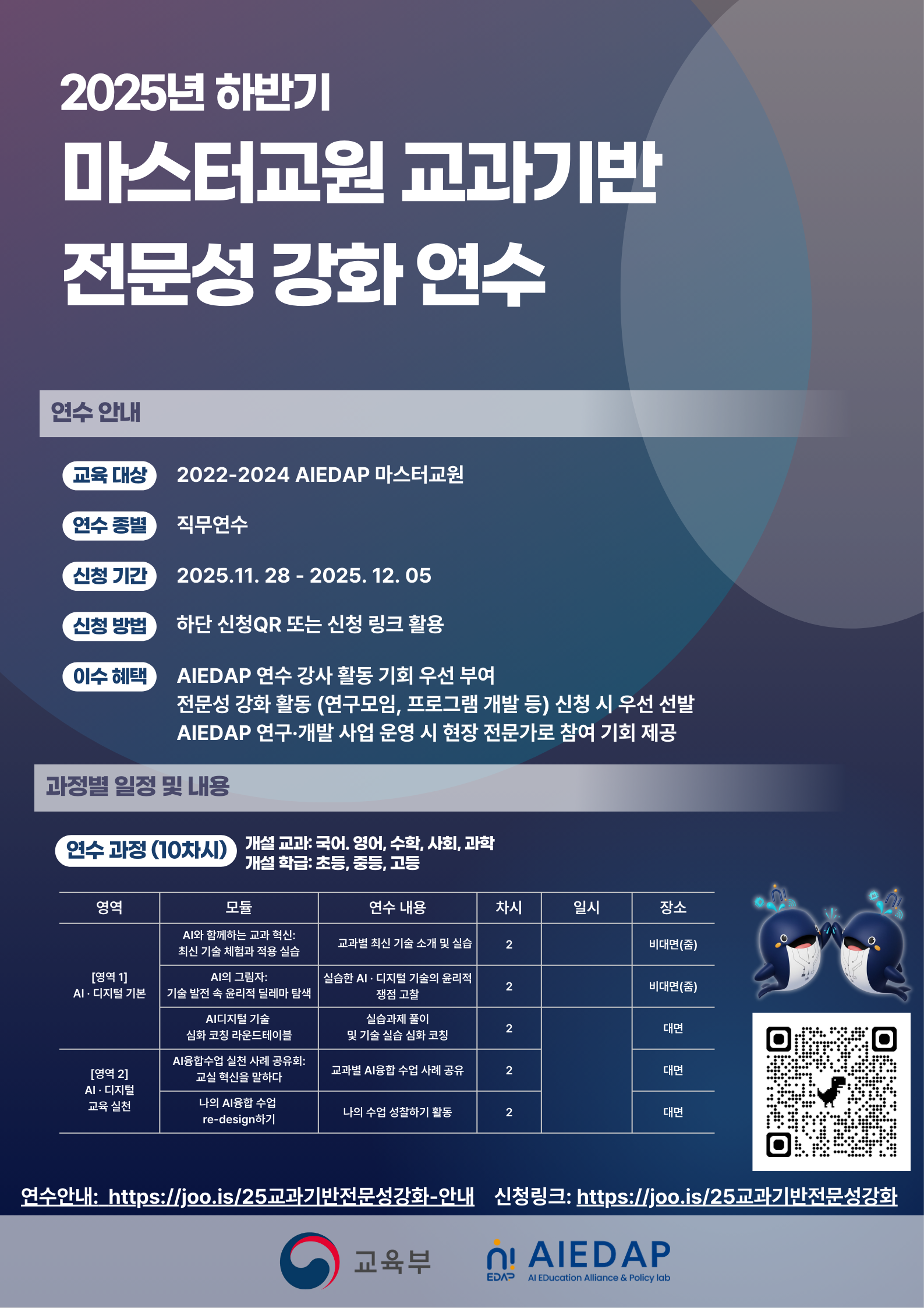 * 단, AIEDAP 수행기관에서 안내한 'AI융합수업 설계 심화형 전문성 강화 연수 안내(https://bit.ly/AIEDAP하반기전문성) 신청자는 본 연수와 중복신청 불가